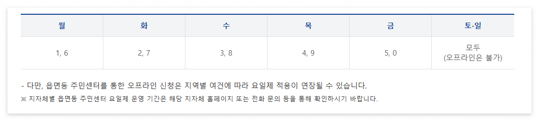 - 읍면동 주민센터 방문 → 신분증 지참하여 오프라인 신청 가능