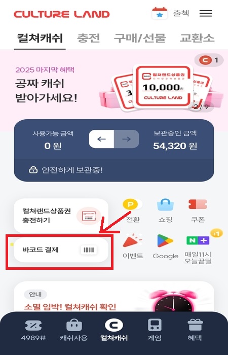 -매장 결제 시 컬처랜드 앱-로그인- 바코드 제시