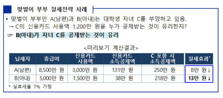 - A (남편)과 B(아내)는 맞벌이 부부이고 C(대학생 자녀)를 부양하고 있다면 C의 신용카드 사용액 1200만 원을 누가 받는 것이 유리할까?