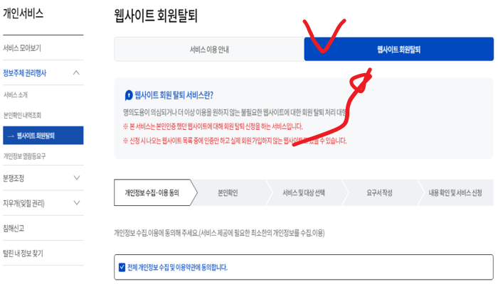 | 1. 검색창에 '개인정보포털' 을 검색하기 2. 개인정보포털 - 오른쪽 상단에 줄 3개 클릭하기 3. 왼쪽에 개인 서비스 클릭 -> 주체권리 행사 4. 웹사이트 회원탈퇴->개인정보이용동의 5. 본인 인증하기 6. 서비스 및 대상 선택->요구서 작성 7. 내용확인 및 서비스 신청 |