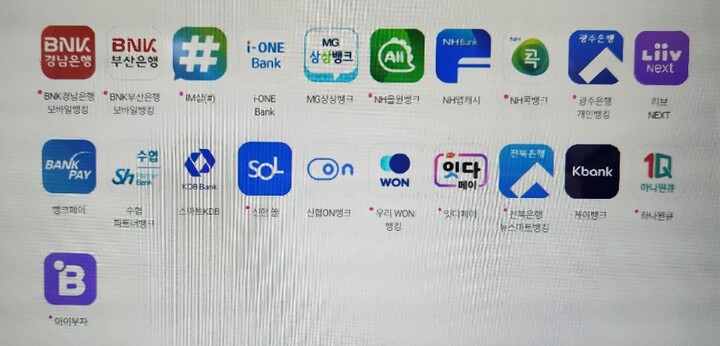 - BNK부산/ 경남은행 모바일뱅킹, IM샵, i-ONE Bank, MG상상뱅크, NH올원뱅크, NH앱캐시, 콕뱅크, 광주은행 개인뱅킹, 리브 NEXT, 뱅크페이, 수협파트너뱅크, 스마트 KDB, 신한쏠, 신협 ON뱅크, 우리 WON뱅크, 잇다 페이, 전북은행뉴스마트뱅킹, 케이뱅크, 하나원큐, 아이부자