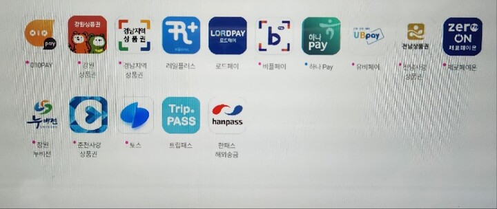 - 010 PAY, 강원상품권, 경남지역상품권, 레일플러스, 로드페이, 하나 PAY, 유비페이, 전남사랑 상품권, 제로페이온, 창원누비전, 춘천사랑 상품권, 토스, 트립패스, 한패스 해외송금 사진