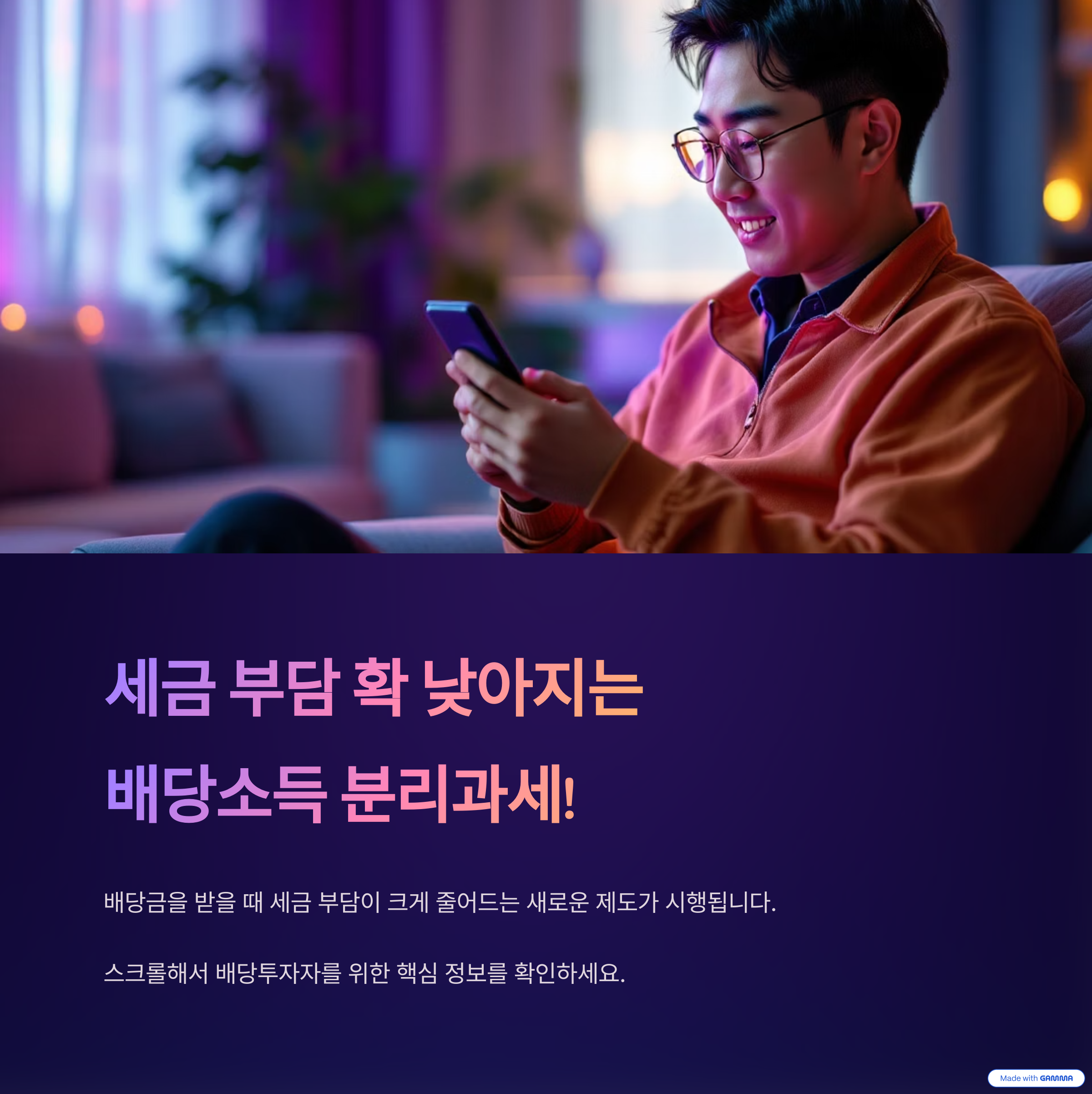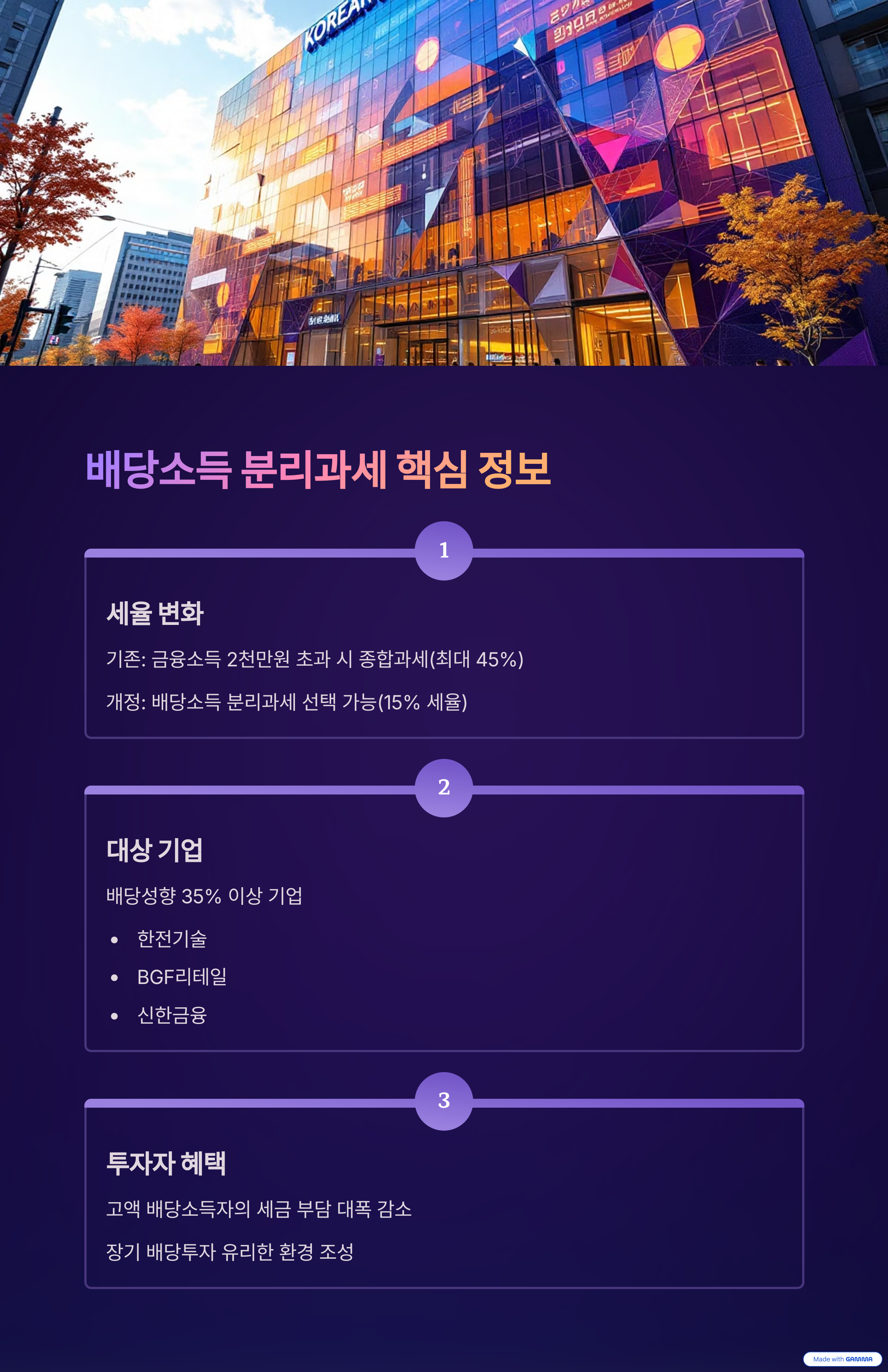 정부는 고배당 투자자들의 세금 부담을 낮추기 위해 배당소득 분리과세 제도를 추진하고 있습니다. 핵심은 다음과 같습니다.