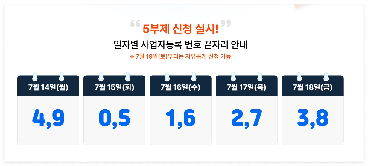 2025년 7월 14일(월)부터 11월 28일(금) 오후 6시까지 온라인(소상공인 부담경감 크레딧)으로 진행됩니다. 사업자등록번호 끝자리에 따라 5부제 방식으로 운영되니, 해당 날짜에 맞춰 신청해야 합니다.